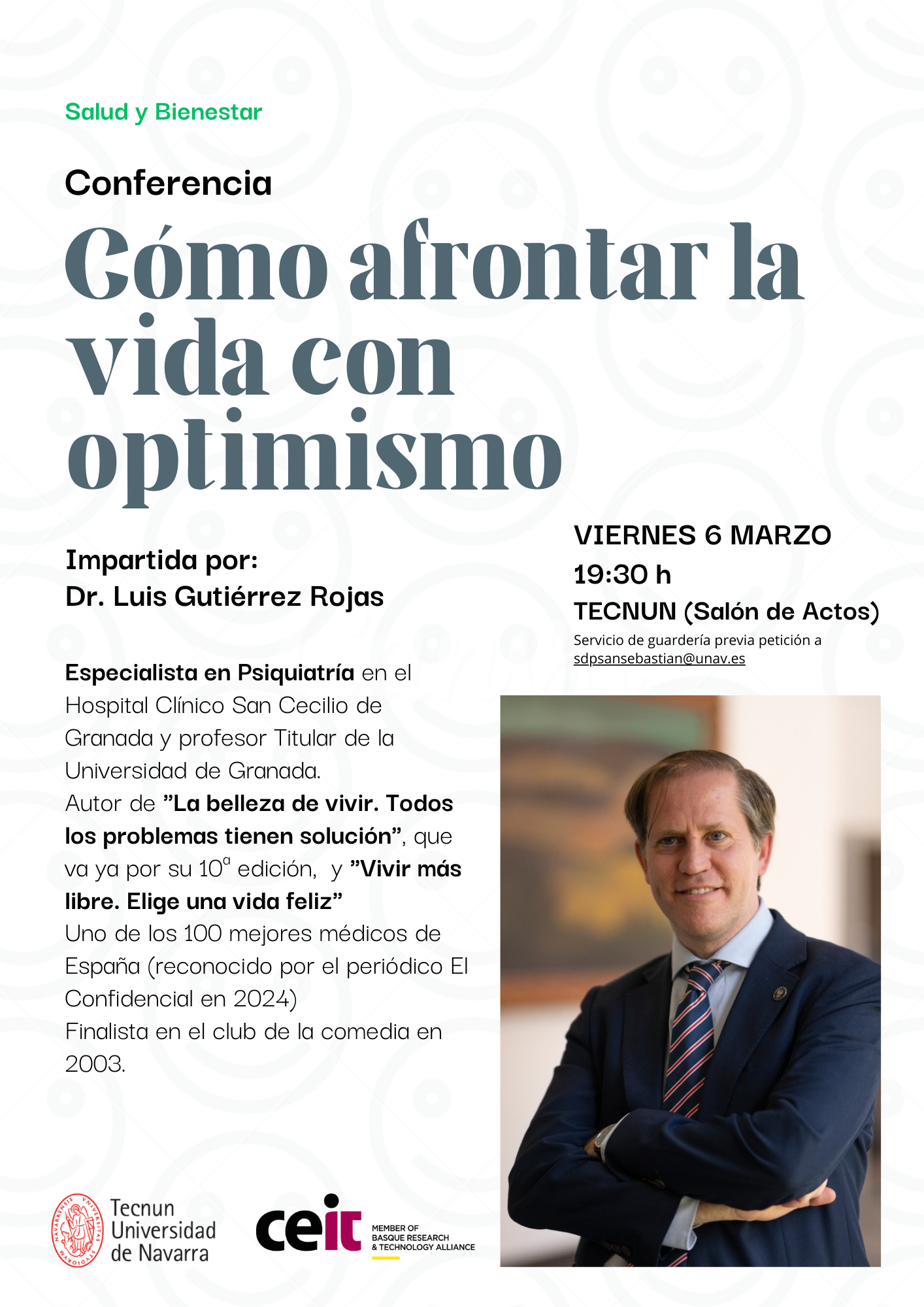 Next Friday, March 6, there will be a lecture "How to face life with optimism," given by psychiatrist Luis Gutiérrez Rojas, at 7:30 p.m. in the Tecnun auditorium . This session, aimed at Tecnun Ceit employees, marks the resumption of the Health and Well-being series. Childcare will be available upon application email, and upcoming activities focused on self-care and healthy lifestyles will be announced.
