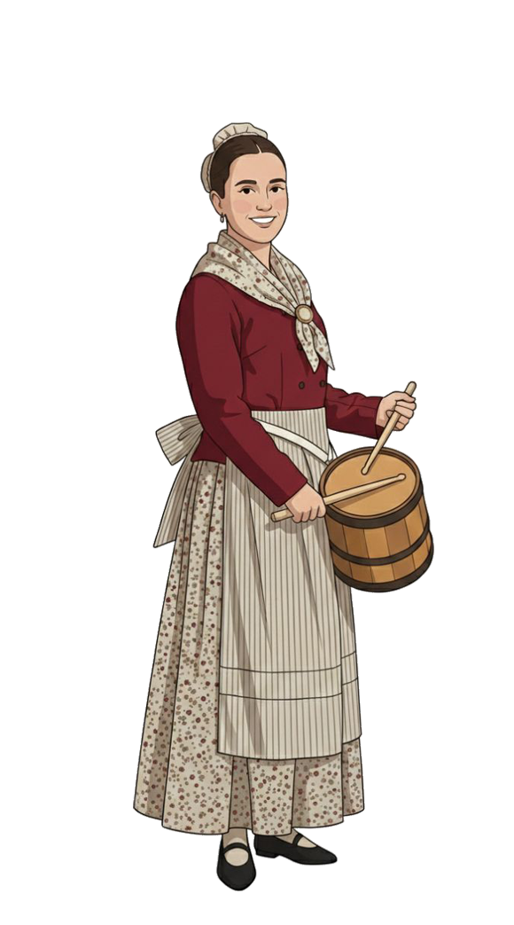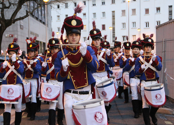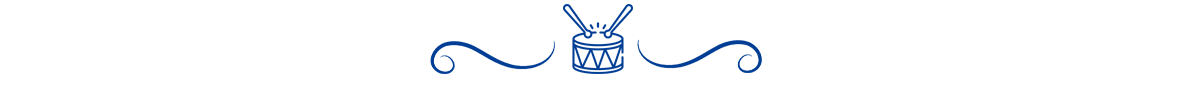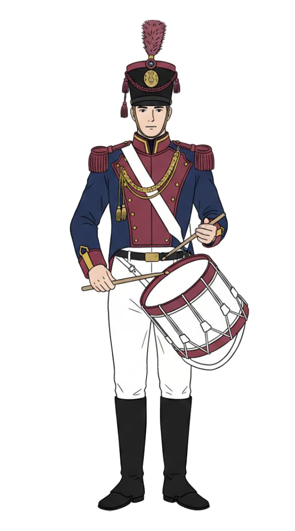 The soldier's uniform worn by the drummers and orderlies was made later and was not available the first edition in 2016. It is inspired by Napoleon's special troops and consists of a Donosti blue jacket with maroon cuffs, front, collar, and shoulder pads, the color that identified the School before the rebranding. The outfit is completed with white trousers, black gaiters, and a black morion decorated with maroon details and a brass shield on the front. The drum covers are white with maroon trim and have white cross straps, completing the classic and elegant look of the uniform. On the other hand, the flag bearers dress the same as the soldiers, with a white pleated skirt adorned with blue satin ribbon.