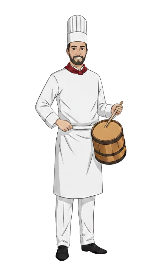 They wear a white chef's uniform with maroon embroidery that includes the company's logo and name.