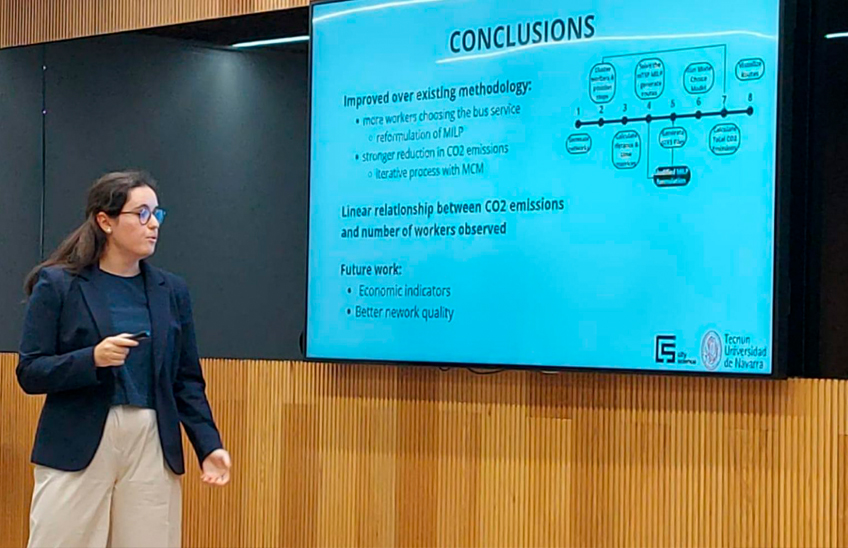 María Peña presenting her final degree project, "A model-based systemic approach to the reduction of commuting-related CO₂ emissions in Gipuzkoa through the optimization of company bus services."